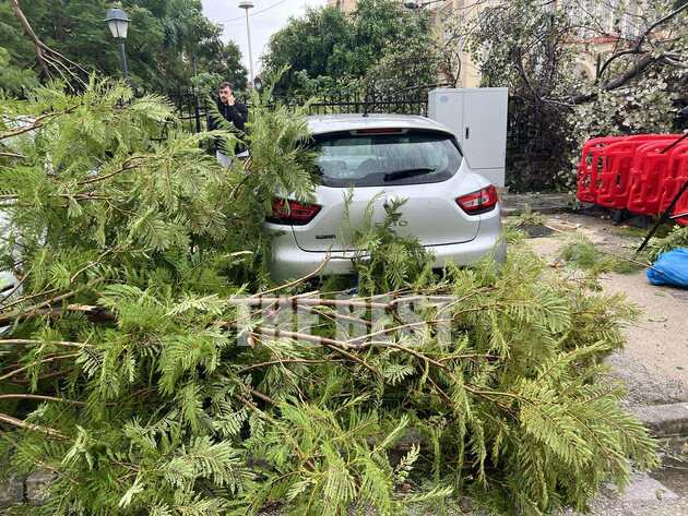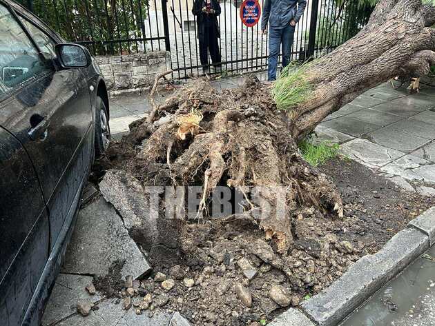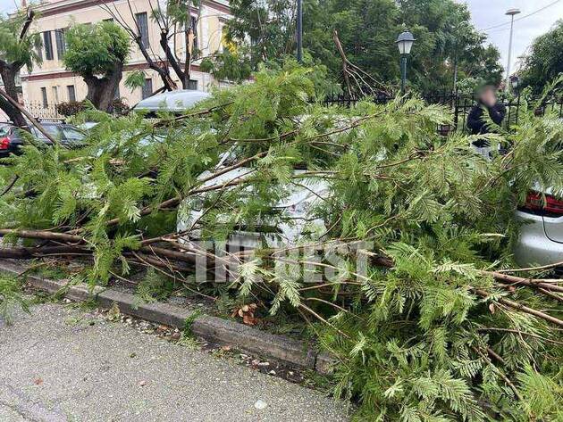 Τα δέντρα (άλλα ξεριζώθηκαν, άλλα έσπασαν), σωριάστηκαν πάνω σε σταθμευμένα αυτοκίνητα ενώ από θαύμα γλίτωσαν οι περαστικοί από το σημείο.